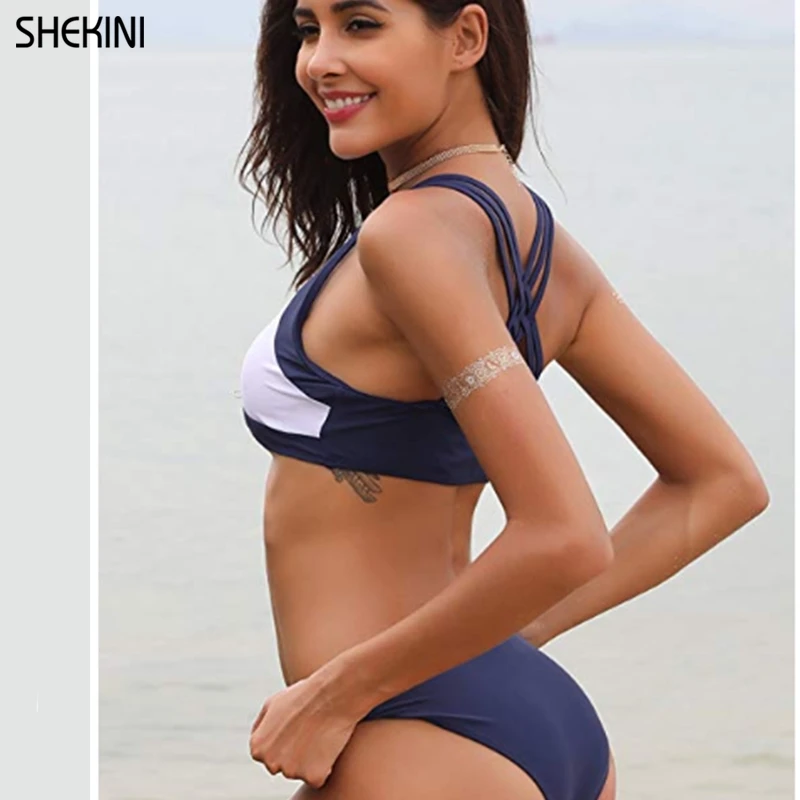 SHEKINI High Neck Cross Back Bikini Set Padding Two Piece Low Waisted Swimwear Ladies Summer Beach